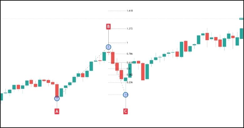 斐波那契延伸工具用于预测未来价格目标,通常在一轮趋势恢复后,用于设置止盈位置。