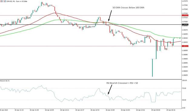 - 当50 EMA(红线)在100 EMA(绿线)下方时,确认空头趋势。在图表中,该交叉出现在21:35。